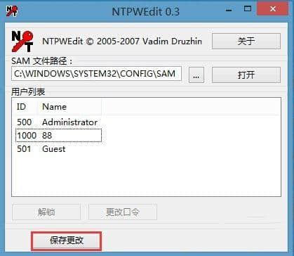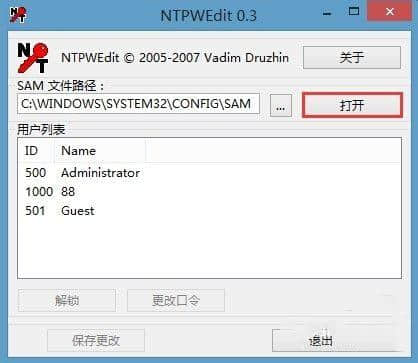 3.这里是NTPWEdit工具界面。单击“打开”获取用户帐户。