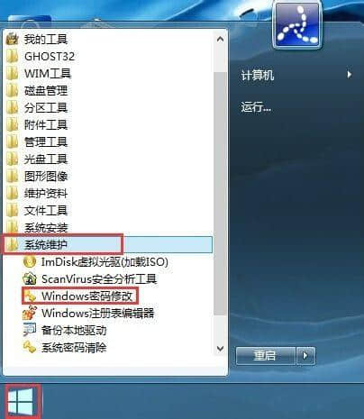 2.进入win8pe界面,依次点击“开始-Windows密码修改”。