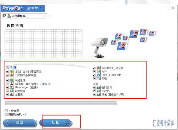 支持电脑硬盘、内置内存、外接内存等设备的痕迹清理。支持IE、火狐、opera、Safari等内核的浏览器痕迹清理。清理内部和外部硬盘、sd卡甚至网络共享文件夹中的垃圾文件。