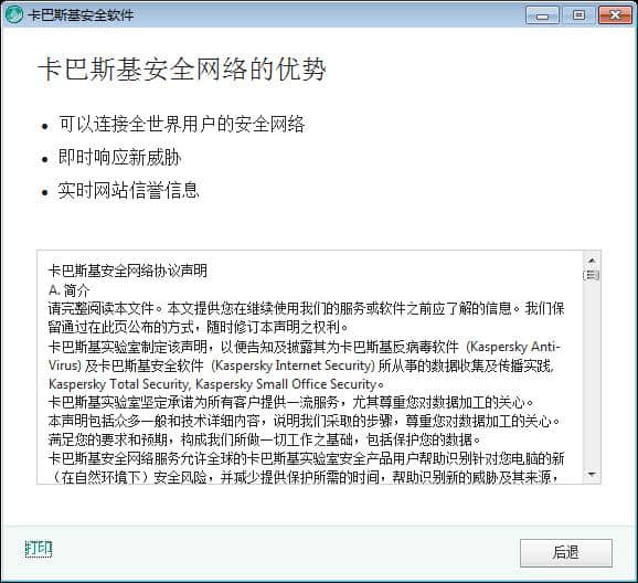 第四步。我们建议您加入卡巴斯基安全网络。如果您同意KSN的说法,请勾选此框。