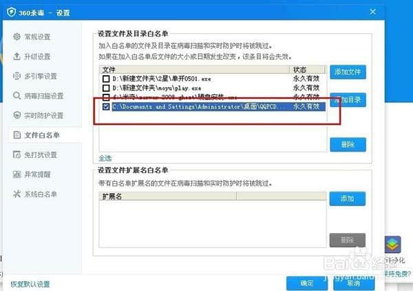 6.此时,您可以在“360杀毒-设置”和“文件白名单”中看到添加的文件,然后单击“确定”
