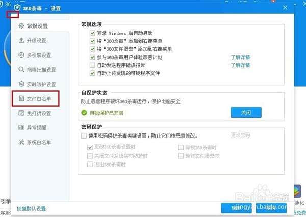 2.点击“360杀毒-设置”界面中的“文件白名单”。