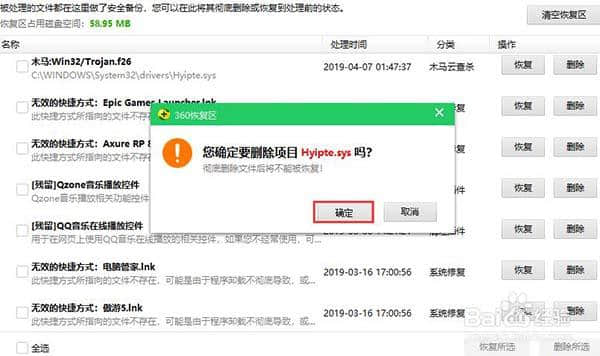 3.单击删除按钮删除相应的隔离文件。