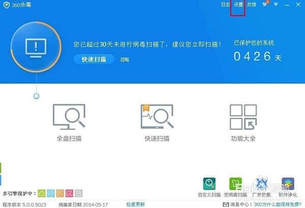 1.点击360杀毒设置,设置一些常用功能。