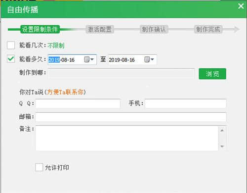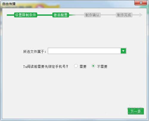 2.然后选择具体的加密方式。第一种“限制手动激活设备”的方法可以实现一机一码,第二种“自由传播”的方法可以随时控制发送的文件。这里默认选择自由传播方式。