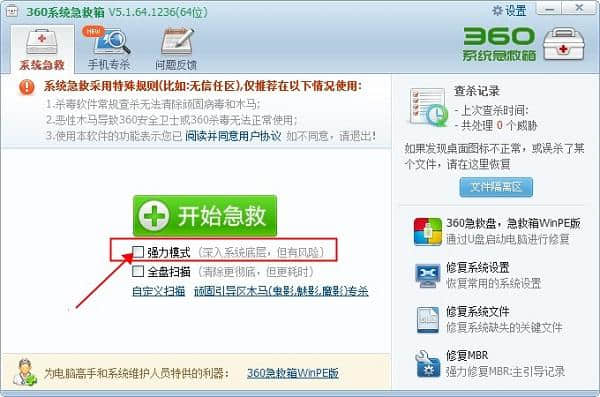 目前,超过一半的电脑配备了360名保安。360的另一个产品,360急救包,也可以帮助我们解决电脑相关的问题。这款软件有几种模式,其中强力模式使用不频繁,所以很多网友都在问360急救箱强力模式的风险。小编我们想告诉大家的是,强大的模式深入底层,所以不要随便使用这个模式。
