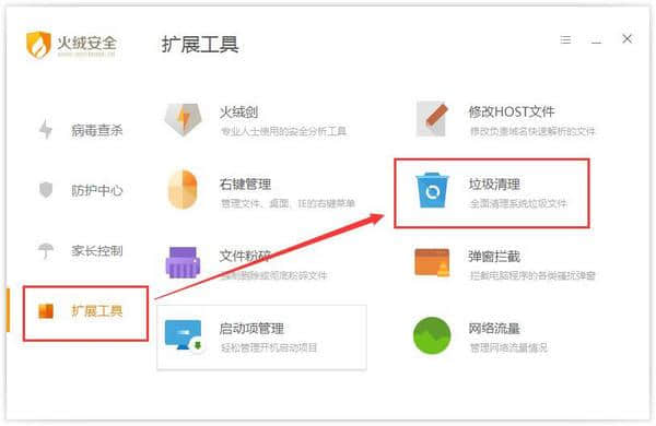 1.打开我们的火绒安全工具,点击左侧白色的“扩展工具”,在右侧面板选择“垃圾清理”;