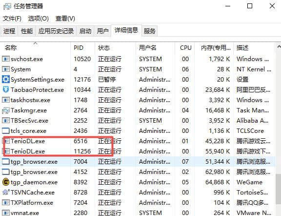 5.进入任务管理器界面,如下图所示,我们在任务中找到了TenioDL.exe流程。任务中可能有两个过程。点一下鼠标后,我们选择结束任务。也许关机后软件会重启。我们可以重复关闭几次。