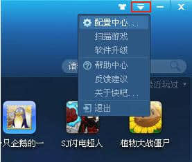 1.如果要升级快吧游戏盒,可以点击快吧游戏盒右上角的“设置”按钮(向下的三角形图标),在其下拉菜单中点击“配置中心”。