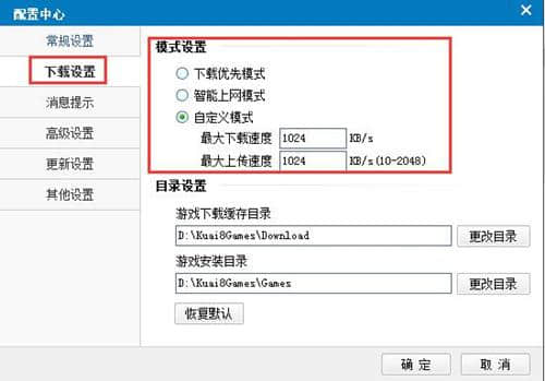 2.在配置中心的弹出窗口中,将选项卡切换到“下载设置”选项。有三种模式:下载优先模式、智能上网模式和用户自定义模式。默认模式是下载优先模式。为了加快上传速度,您可以选择“自定义模式”并手动输入您想要设置的号码。这种模式相对自由。