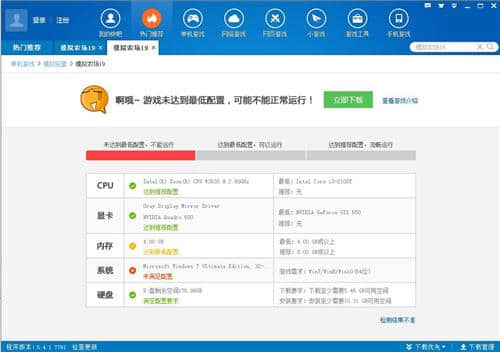 4.点击配置测试后,进入如下界面。测试完成后,会给出一个条,可以清楚的看到你的电脑是否可以安装这个游戏。因为小编的电脑配置太低,你会看到下图。如果是这种情况,就不能安装游戏,只能换。如果检测符合配置,可以下载播放。