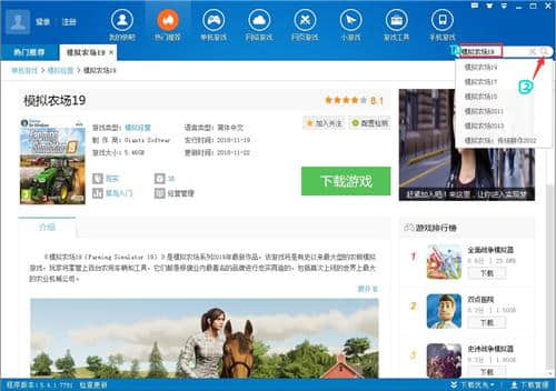 2.除了在功能区下搜索自己的游戏外,还可以通过界面右上角的搜索框进行搜索,直接输入游戏名称或关键词,然后点击“搜索”即可快速找到想要玩的游戏。如下所示,输入模拟农场19并单击搜索。