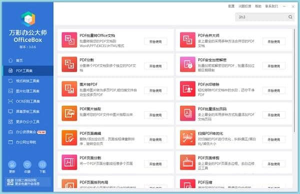 1.PDF套件:主要包括PDF转WORD、PDF分割/合并、PDF页面分割/裁剪、PDF歪斜校正、图像转PDF、彩色PDF转黑白、PDF图像提取、扫描PDF转优化、PDF链接、PDF水印添加/移除、PDF安全加解密等19个功能强大的PDF处理工具。