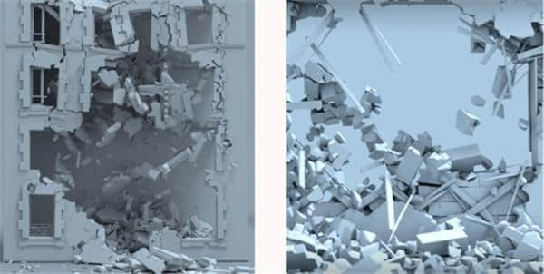 1.交互拆解:在仿真过程中,根据材料和碰撞强度创建动态仿真,对物体进行拆解。
