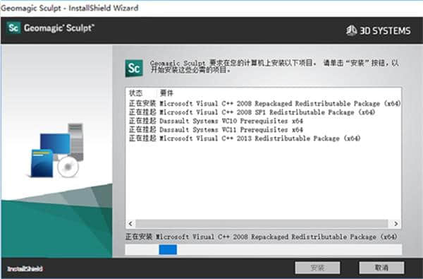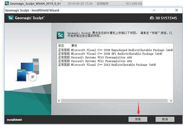 1.本网站下载压缩包,解压后双击Geomagic _ sculpture _ win 64 _ 2019 _ 0 _ 61.exe安装,点击安装。这里,安装了软件运行所需的运行环境工具。
