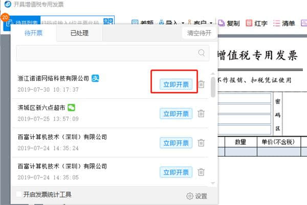 4.商家可以高速开票。在开票软件中,打开“发票管理-发票填制”,点击开票页面左上角需要打开的列表,找到对应的企业,点击“立即开票”。此时,计费表头自动完成填写。