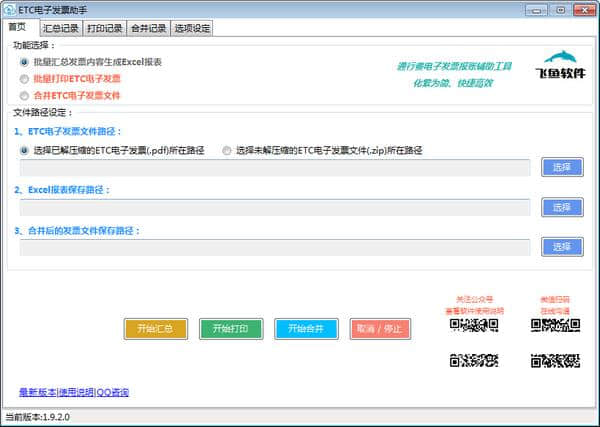 1.ETC电子发票台账功能界面,功能选项包括:批量生成Excel报表和批量打印PDF发票,点击可更改设置文件路径。