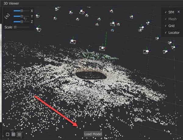 5.在右上方的“3D Viever”窗口中,可以看到已经对相机镜头的位置进行了分析,产生密集的检测点,然后点击底部的“Load Model”加载并构建3D模型。