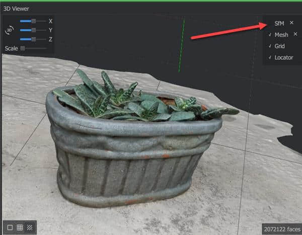 6.您可以取消选中“SfM”选项并隐藏检测点,以获得更完整的视觉效果。操作方式是点击拖动鼠标“旋转”模型,按鼠标中键移动。顺便说一下,左下角的选项是视图模式,实体是没有材质的模型,线框是线框模式,纹理是有材质的模型,模型的面的数量显示在右下角(2000