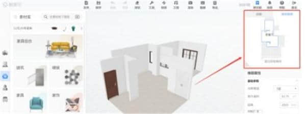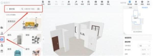 9.点击页面左侧的“公共素材库”,可以在左侧类别中选择家具模型,也可以直接在搜索框中输入关键词搜索家具模型,拖动到画布中放置。