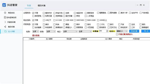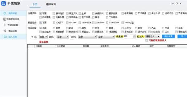 6.点击“获取达人”按钮,通过设置主品类、粉丝数量、内容类型等条件,对产品进行过滤收集。