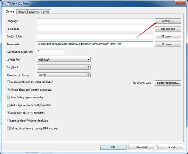 2.单击菜单栏中的“设置”并选择“选项”。在弹出的对话框中,可以看到“语言”,点击右侧的“浏览”。
