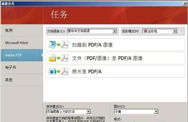 1.打开安装ABBYY FineReader软件,点击左上角文件菜单中的“新建文档”选项,从弹出的选项中选择“新建任务”。打开新任务窗口后,有三个选项:“扫描到PDF/A图像”、“文件(PDF/图像)到PDF/A图像”和“照片到PDF/A”,可以根据自己的实际情况打开。