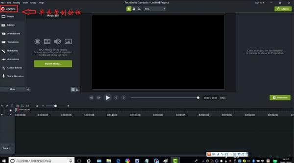 1.打开camtasia studio软件进入主界面,点击录制按钮进入录制界面。