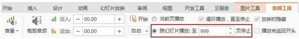 插入背景音乐后,幻灯片中将显示一个小扬声器。选择小音箱,点击功能区的“音频工具”,设置播放页面的范围。