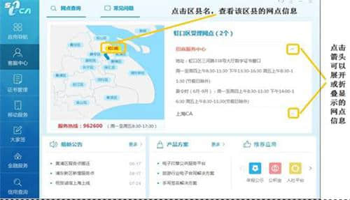 用户可以在客户端软件中找到上海CA在各区的服务网点以及常见问题的解答。