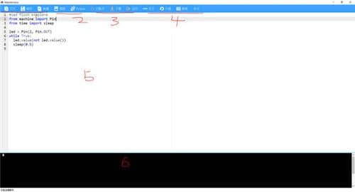 1:文件操作区,打开和打开文件内容,保存和保存文件,创建新文件。