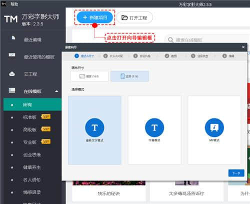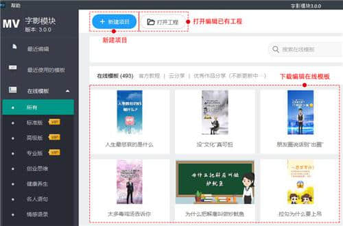 2.在万彩微影字体模块中,有三种创建项目的方法:下载和编辑在线模板、打开和编辑现有项目以及创建新项目。
