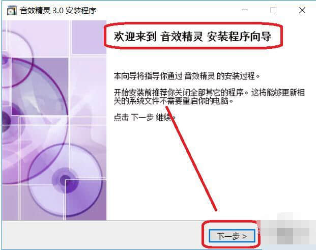 2.开始安装后,会出现如下截图:是音效精灵安装向导界面,请点击【下一步】按钮开始安装,打开安装向导,点击【下一步】继续安装。
