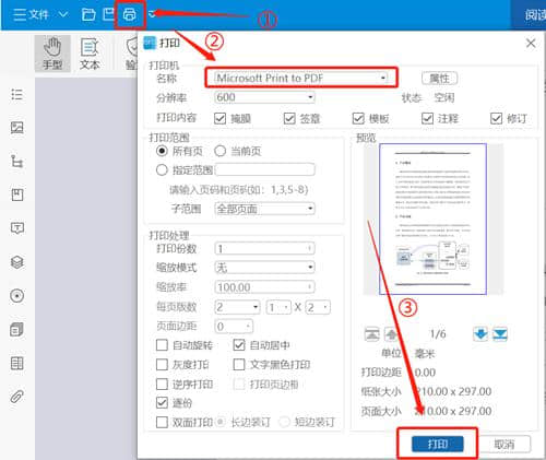 2.点击工具栏上的【打印】,选择【微软打印为pdf】作为名称,点击【打印】将ofd转换为PDF格式。
