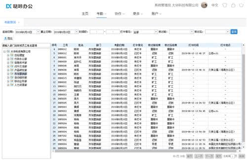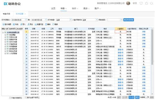 5.考勤查询:可以随时查询某段时间内员工的打卡记录和考勤结果,包括员工是否打卡、打卡的时间和地点、考勤前后的结果等,可以根据需要导出。