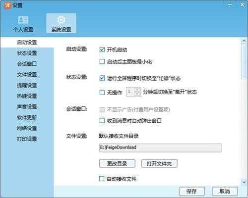2.在“设置”中,可以修改启动项目、默认文件接收目录、自动接收、提醒和自动更新选项。