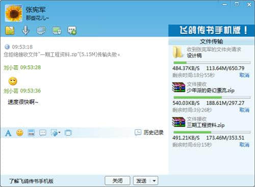 1.飞鸽传书极大地改善了用户的文件传输。除了选择通过聊天窗口发送文件,还可以将需要发送的文件直接拖拽到好友列表的头像或者聊天窗口发送。