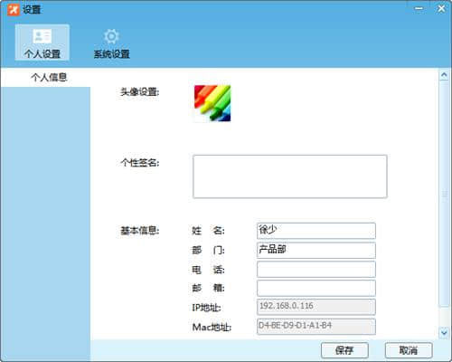 1.通过“个人设置”,用户可以自定义头像,修改签名、姓名、部门等。单击保存后,局域网用户可以查看您的设置。