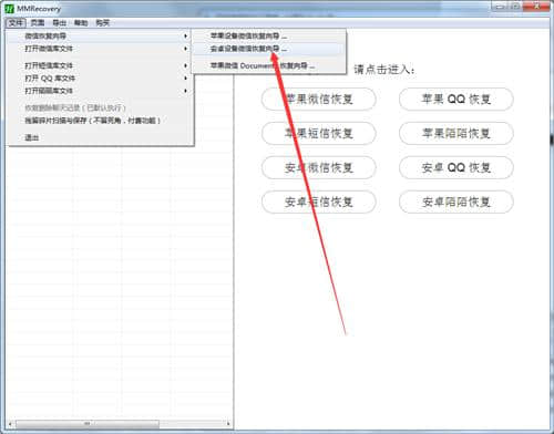 2.点击菜单“文件”= >;“微信恢复向导”= >;安卓设备恢复向导,会弹出微信恢复向导对话框,如下图所示: