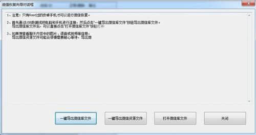 3.在“微信恢复向导”对话框中,首先通过USB数据线连接电脑,点击“一键导出微信库文件”按钮,即可导出微信库文件。如果你想看图片、声音等。在聊天内容中,请点击“一键式导出微信资源文件”按钮导出微信资源文件(导出微信资源文件可能比较慢,需要耐心等待,弹出的黑色窗口消失后导出才会结束)。