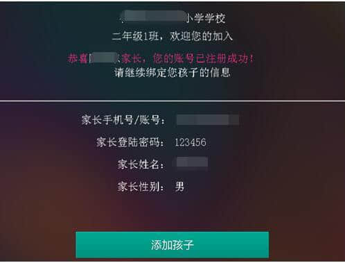 家长可以成功注册,然后点击添加孩子(注册孩子)。输入孩子的姓名、性别和与孩子的关系,设置孩子密码并确认密码。单击确定。即孩子注册成功,孩子通常是s+父母的号码。