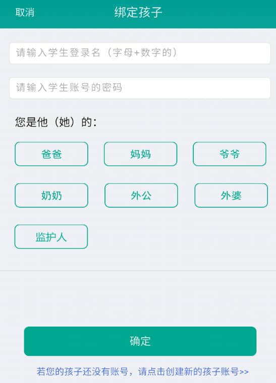 点击绑定子,填写您的基本信息,点击“确定”按钮完成绑定。