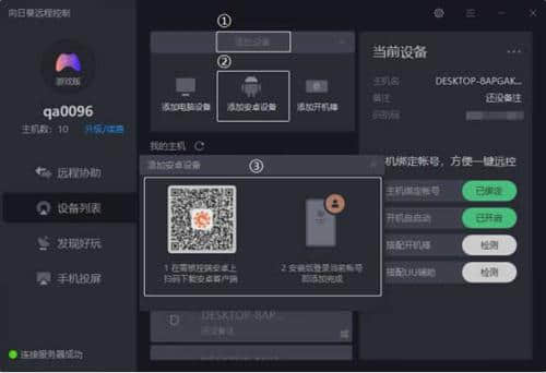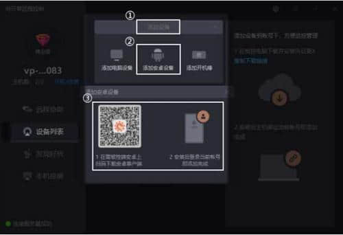 点击“添加安卓设备”,通过扫描二维码下载安卓客户端。安装后,使用与此计算机相同的密码登录,然后将主机添加到。