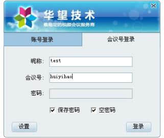 三、输入指定的会议号和会议室密码登录;如果会议室不需要密码,选择“空白密码”并点击登录: