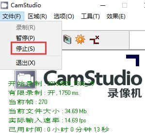 4.如果要停止,请点按camstudio菜单栏中的[文件],然后点按弹出式选项中的[停止]。