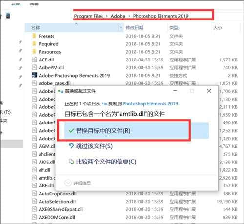 2.安装后关闭软件,并在程序的安装目录中替换破解的补丁amtlib.dll。默认位置是C: 程序文件 Adobe Photoshop elements 2019。