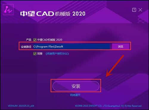 1.下载exe安装程序,双击zwcad _ mechanical _ 2020 _ CHS _ win _ 64bit.exe程序打开软件安装目录,选择安装路径,勾选我同意按钮,默认安装路径为C:Program FilesZwsoft,点击安装。
