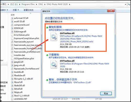 5.安装完成后点击关闭,打开下载包,找到ONToolbox.dll激活补丁,将补丁文件粘贴到ON1 Photo RAW 2020的安装目录下替换原文件,路径参见步骤2,替换成功。