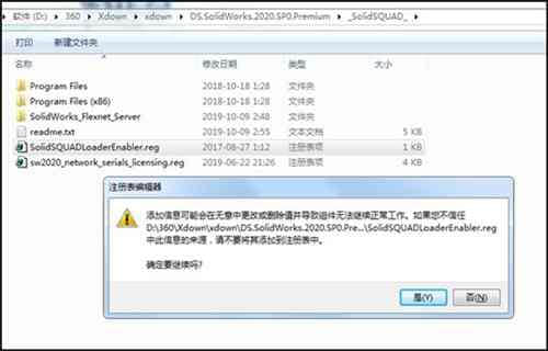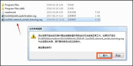 2.在_ solidsquid _文件夹中找到并运行注册表文件SW 2020 _ network _ serial _ licensing . reg,然后单击“是”。
