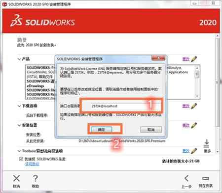 5.运行SolidWorks2020的主安装程序,按照默认提示@填写25734@localhost,继续下一步安装到许可证服务配置界面的端口,点击确定。